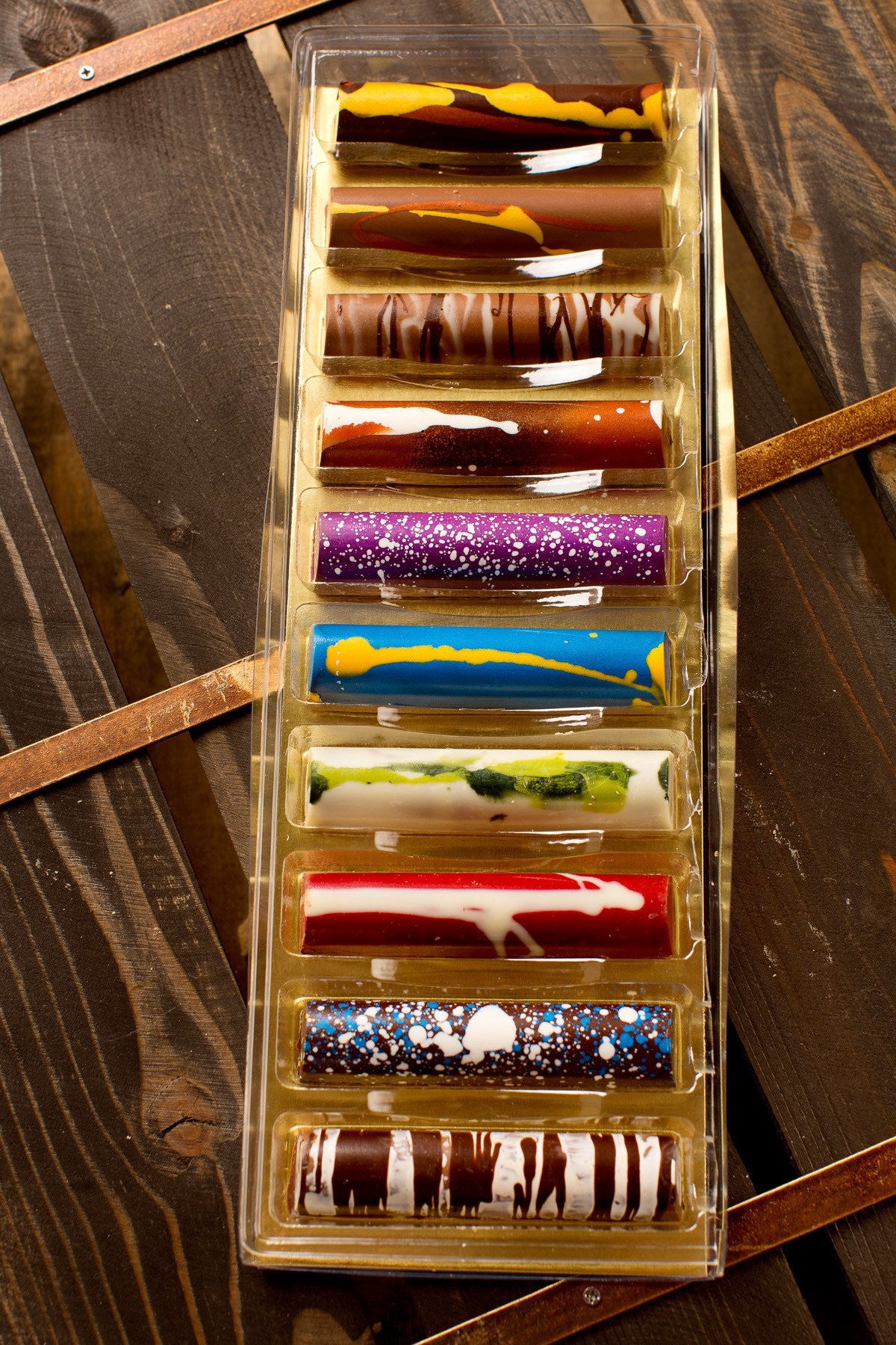 Chocolate Moonshine Bars are wrapped in pure Belgian chocolate, filled with a silky smooth center made of cream & fresh-pressed fruits, and uniquely hand painted with French cocoa butter.